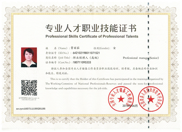 銀川伊百盛生物工程有限公司行政部經(jīng)理賈麗茹榮獲“專業(yè)人才職業(yè)技能證書”